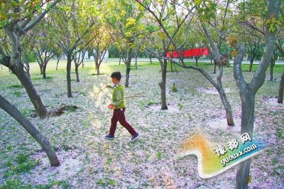 昨日大风,洛浦公园樱花林内,花落一地,树也歪斜。